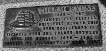 If you're walking along the Government Street causeway, there are two plaques referring to Victoria's own clipper ship. The plaque seventh in from the south end, placed by Robert Reford Inc., Montreal, Q.C, commemorates Thermopylae’s serviceto their company in the 1890s. A little further north, in the recess behind James Cook's statue, is a plaque placed by the Thermopylae Club in 1962. It commemorates the time when the Thermopylae was based in Victoria and shows all her years of work. There is an engraving of the ship on the plaque, an honour which none of the other plaques have.