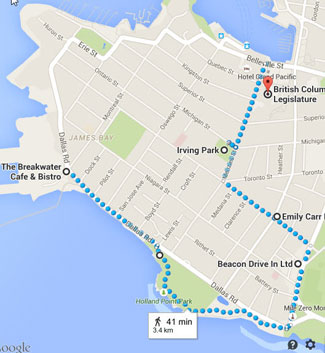 I pass the Beacon Drive In Restaurant. Wikipedia quotes on the restaurant: “Founded and built in 1958 by Bill Pistol and Bob McMillan, it has become known as a Victoria institution for its soft-serve ice cream, friendly service, and local clientele.” Great place for a stop! I head down to Simcoe Street and turn left. Enjoying the historic homes as I walk down Simcoe, I turn right on Government Street to have a quick look at Emily Carr’s House. It is closed by the time I get there, but I enjoy a little walk in the garden around the house. Then it is back to Simcoe Street, heading for Menzies where I turn right at the Bent Mast Restaurant. Walking down Menzies Street, I soon pass Irving Park where the brightly painted mural beside the fence cheers the place and five giant sequoia trees soar straight to the sky. I am in awe of those trees every time I pass this spot. Continuing down Menzies, I soon reach the Legislature Buildings. Time to find one of those hard ice cream places! Enjoy your summer and discover more walks around our amazing community. I’ve only scratched the surface!