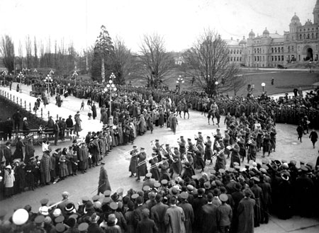 The 30th Battalion leaving to participate in the Great War. Image A-03128 courtesy of Royal BC Museum and Archives |