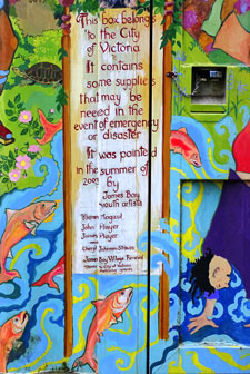 Across Victoria, there are 12 large containers, each close to a facility which could be used as a reception site. There is a very colourful one in Irving Park beside the James Bay New Horizons. This container is filled with paperwork, but also cots, blankets, cooking supplies etc. – all those things needed for the Evacuee Assistance Team to transform the facility (in this case, New Horizons) into a Group Lodging or Reception Centre. If New Horizons should be deemed unstable, then the contents would be taken to another location.