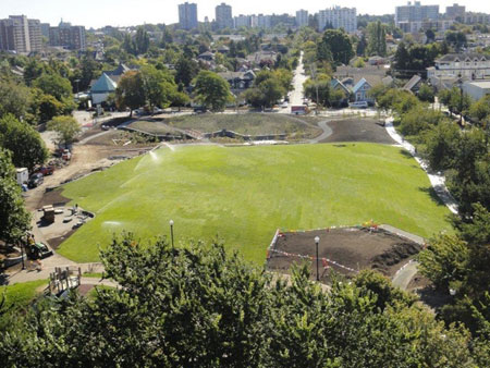 After a hectic summer of hard work by city parks staff, the new and improved Fisherman's Wharf park is ready for public enjoyment. Grassy hills to sit on or roll down, a rain garden, a boardwalk, a sinuously curving rock wall delineating the original harbourfront, and berry-producing native shrubs now grace what was once a flat, boring field. Residents have been eagerly awaiting the changes and are impressed with what they see. "It's amazing. We live in such a beautiful place," enthused Stirling Chow, who lives a few blocks from the park. Other residents, who have been enjoying the new children's play area for more than a year, are equally happy to see the work completed and say that the play area, although small, is still one of the best in town, with a great mix of equipment for kids of all ages.