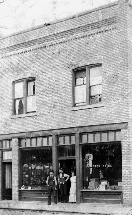 This photo of Fred Paines Grocery Store was taken at some time prior to 1919. A glimpse into the windows suggests that Mr. Paine offered patrons household goods as well as groceries, a convenience store of the time.