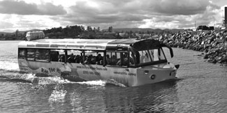 Henrietta, photographed coming ashore at the Dallas Road boat launch, is one of three specially designed amphibious vehicles roaming our neighbourhood this tourist season. Each vehicle will carry up to 40 passengers and is skippered by a licensed Transport Canada fully certified motor-coach operator. The other hippos are called Happy and Harry.