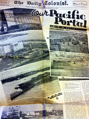 That wonderful old yellow newspaper has been a source of unending fascination for weeks: "The Daily Colonist", Sunday, February 12, 1939. "Our Pacific Portal," written by F. M. Kelley, occupies a whole page and shows spectacular photos of the old Ogden Point Grain Elevator, Cold Storage Plant, Pilot Boat Mooring area, Rithet Ocean Piers, and a room full of crates and bags full of who-knows-what. The pictures show a gargantuan operation at Ogden Point in those days, a bristling, actively busy and very important international port of call.