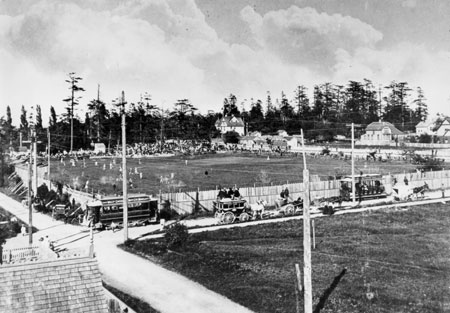 Over the years the Games have been held at a number of locations. From 1869 the Society held property on Cook Street, just north of Yates Street. In 1887 they bought undeveloped land here in James Bay for a sports ground. Lying between Government, St. Andrew's, Niagara and Simcoe Streets, it was named Caledonian Park, and for the next twenty years the field became home for Victoria's Highland Games, as well as a venue for numerous other community sporting events.