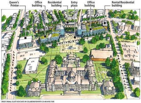 The second presentation was the much-anticipated first look at the proposed re-development of South Block, the almost six-acre site within the 500 block of Michigan and Superior Streets, 'behind' the Legislative Buildings. The proposal was presented by Rob Jawl of Jawl Properties (Victoria), and Brian McCauley of Concert Properties (Vancouver), the new owners of the site, and Architect Alan Endall of Endall Elliot Associates (Vancouver).