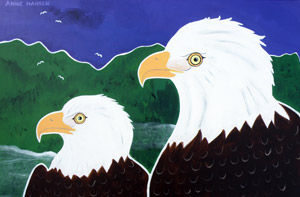 Anne Hansen is a different species of wildlife artist. There is much wildlife art that borders on clinical illustration. Anne celebrates her subject matter with spirited, playful paintings that put her in a class of her own. Anne ushered in 2014 with paintings of bald eagles. Determined some time ago that she would never paint bald eagles, "because everyone else does," she has now changed her tune. "I needed a bald eagle as one of many characters in an oystercatcher painting. I loved doing the eagle so much that I couldn't stop." |