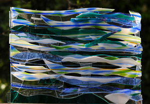 Martine works with kiln-formed glass. She will unveil her bright, newly refurbished studio and workspace for Art Walk walkers. Marvel at Martine's creative and beautiful fixing job of a hole in her studio floor with a mosaic of colorful glass bits. One of her enduring artworks, which came to be known as "The Hanging Gardens of Merrickville," (in Ontario, where she lived) consists of over 15 streamers made from recycled glass. Hung in the canopy of two large maple trees, some of them are forty feet in the air, having been shot into the trees with a homemade bow and arrow. |