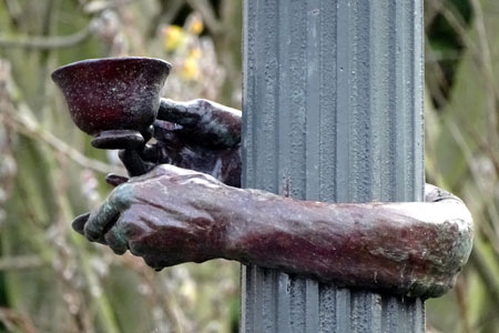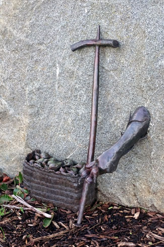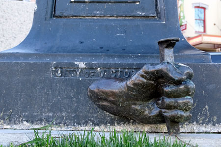 #2 Holding a Railway Spike This sculpture references the island railroad in the 1880s which connected Victoria to the railway system of Canada. |