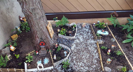 An unused area in an odd corner adjacent to the main entrance was chosen. It was a neglected, untidy spot and recipient of cigarette butts and other detritus. Not a growing thing was to be found there. Today it is an enchanted place for gnomes and fairies and children of all ages. It is a wee bit of magic!