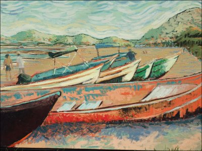 Kenna's subject matter is portraits and the figure in action. She did a "short stint at the Vancouver School of Art, which was a waste of time," she recalls. "I wasn't comfortable with the medium at the time, which was painting. I completed a year of art school here in Victoria in 1967, and that was a lot of fun and a little learning. I learned how much I loved playing with colour and recognized the work of others that I wished I could produce. One student in that class produced work that was very similar to Jim Gordaneer's paintings. I really admired that student's work."
