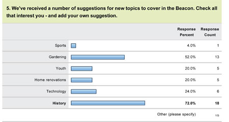 The Beacon's first reader survey ran in the April issue of the paper. A low response rate and lack of a systematic sampling process mean that the opinions we received don't necessarily represent all of our readers, but nevertheless, we thank all of you who took the time to answer our questions. You have given us an important starting point for improving our community newspaper.