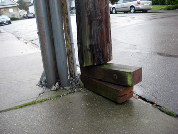 Some time in the summer BC Hydro crews came to set up a new pole, vertical this time. They put the new transformers in place and reconnected all their wires, covering some of them with the old rusty channels and some with new channels. They secured the new post with two cables, but left one new anchor in the sidewalk without connecting it to the new pole. They left a mess around the anchor, shovelling some of the broken cement and rocks onto our flower bed. Meanwhile, they reset the old pole, on which loose wires were still hanging, on two blocks of wood and braced it to the new pole.