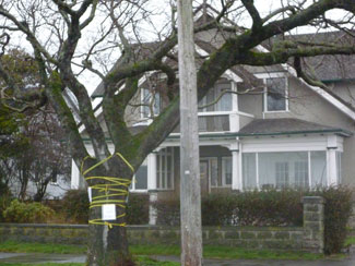 Attached is an artist's rendering of the proposed project that pictures the tree as it stands now. I've tied yellow ribbons with "do not cross" signs around the tree to raise awareness in the neighbourhood of the potential removal.