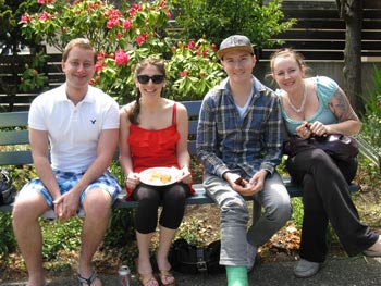 The James Bay community has put its collective arms around this young man who works as a teller at our community Bank of Montreal. Community residents and BMO staff and customers came together to raise money to help Chris. Jim Hill and Don Hume, BMO customers, spearheaded the whole fundraising drive. Sherri Nilsson from BMO arranged for Chris' friends to be there. Patrons and staff of New Horizons worked hard to show their support. Many James Bay-ites donated cash and clothes for the sale. Local businesses donated food and money. Chris was very moved: " It has turned into this amazing thing! It is so busy today. I am so surprised at how many people really care!"