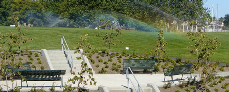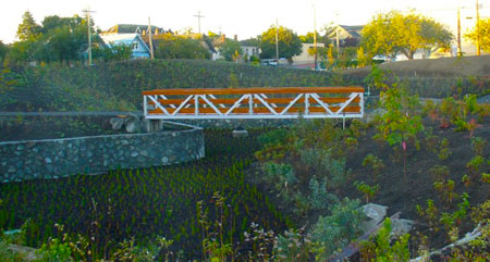 In consultation with the community, City staff developed a management plan for Fisherman's Wharf Park in 2009 to transform an underused sports field into a natural park with more amenities. The new rain garden represents a stream that once existed there, and is the largest in Victoria, intercepting two storm drains that currently collect runoff from 14,250 square meters of hard and paved surfaces in the James Bay neighbourhood.