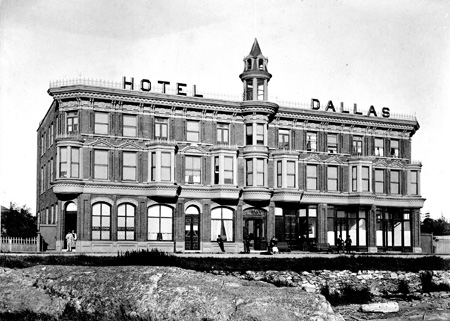 William Jensen, who had experience with a number of hotels in Victoria built the Hotel Dallas on a half acre of land at the foot of Ontario Street. Construction was of brick. The hotel provided first class accommodations with sixty-five bedrooms and twelve sitting rooms. It boasted "all the modern appliances, including hot and cold water baths, steam heat, electric lights, electric call-bells, bar and billiard rooms..."