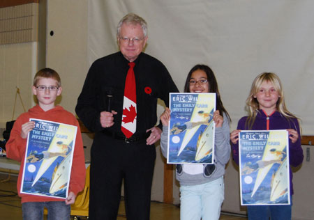 On a Canadian tour to promote his latest book, James Bay resident Eric Wilson stopped off in Humboldt, Saskatchewan to address the Grade 6 & 7 students from the three elementary schools in that city. Here he is pictured with one student from each school, each holding a poster for his Emily Carr Mystery for their school’s library. Wilson kept the audience captive for an hour with stories about how he began writing children’s books, his life as a teacher and a writer, and gave the children tips about being good writers.
