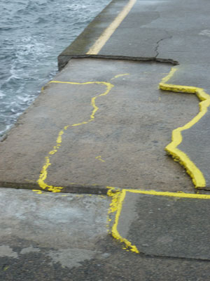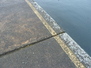 Cracks in surface: Structural cracks in the walking surface of the breakwater may create new safety concerns. Graham worries that they may serve as "traps" for the thin wheels of strollers and walkers. |